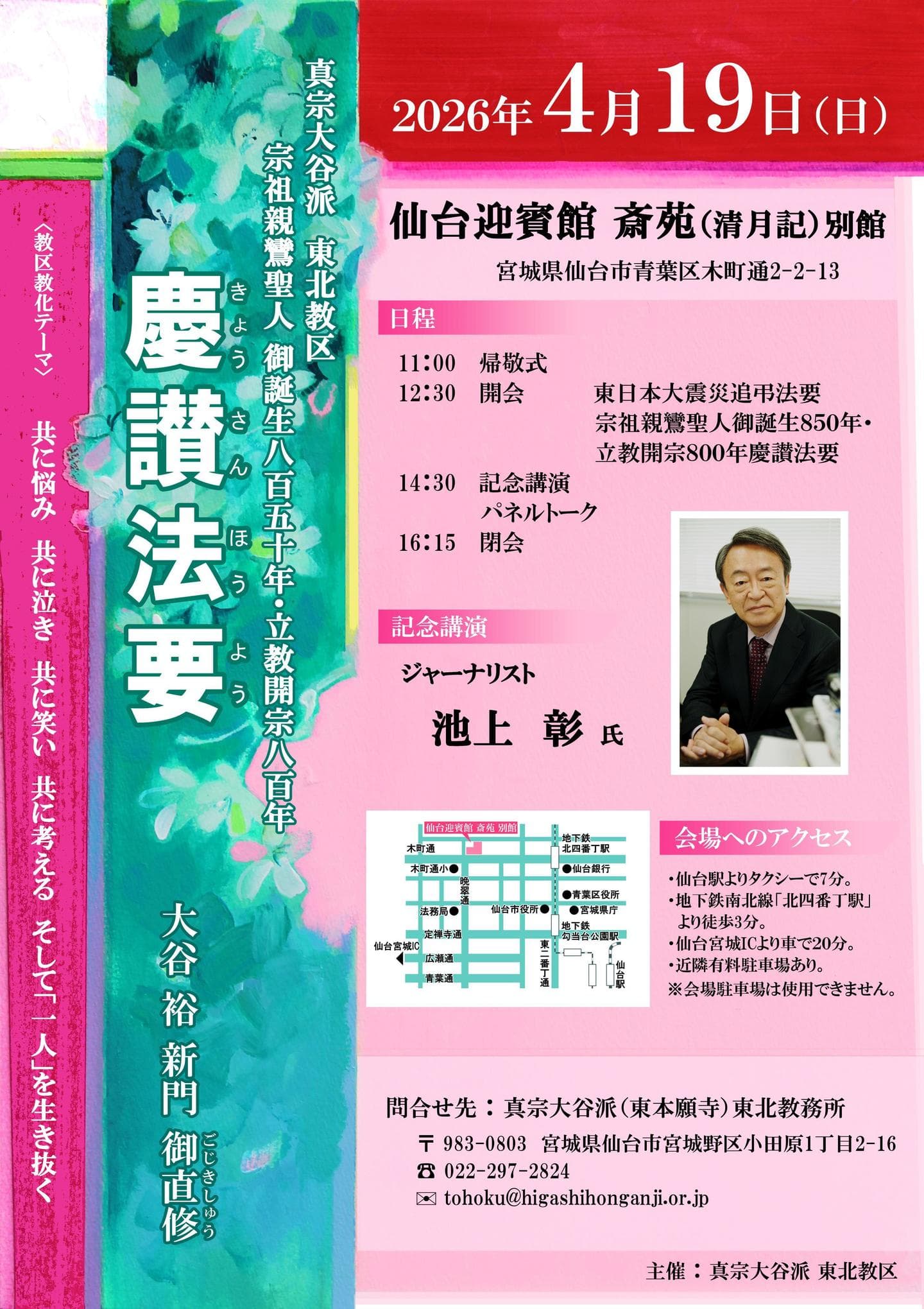 このたびの東北教区慶讃法要は、「共に」をコンセプトに、「御同朋」の精神を生きられた宗祖親鸞聖人の御誕生と立教開宗を慶び、その教えをいただきなおす法要です。