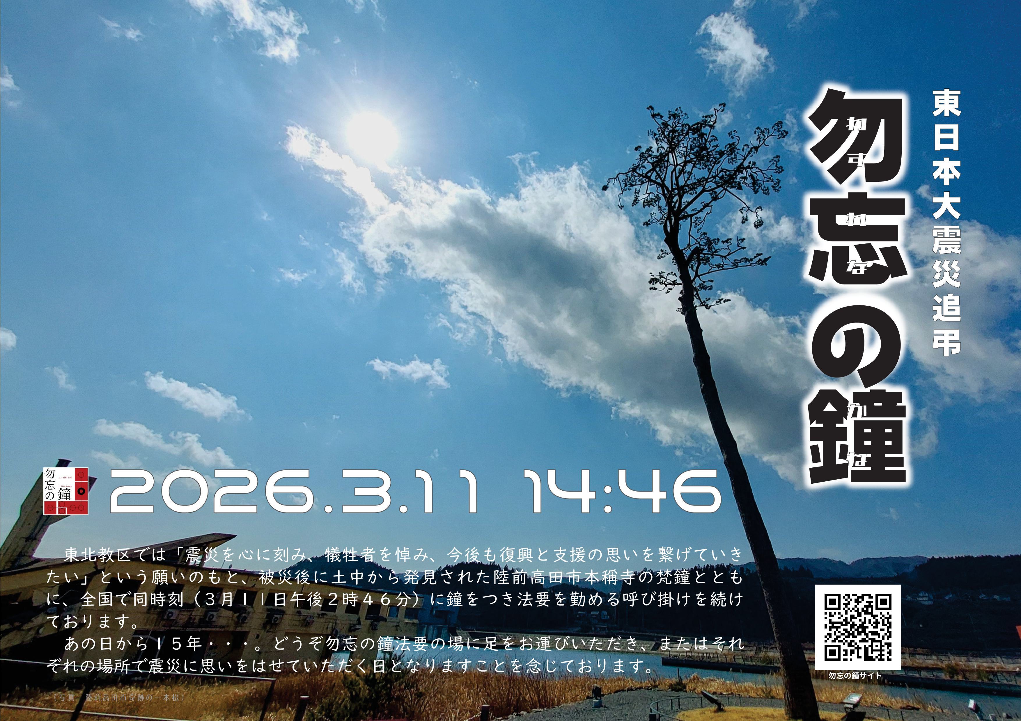 あの日から忘れられぬ悔しさ、悲しさ、寂しさをずっと抱えて暮らす人が今もいる。その起きた事実を「忘(わす)れること勿(なか)れ」と、東日本大震災の発生した3月11日14時46分より、東北別院では「勿忘の鐘(わすれなのかね)」のご法要を勤めております。